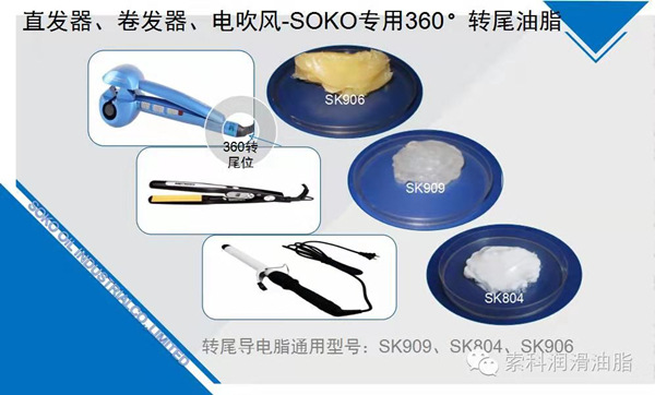SVKV索科轉尾油脂專為直發(fā)器/卷發(fā)器360度無死角長效應用,有效減少磨損,對塑膠及貴金屬無化學反應,SVKV索科專用轉尾油脂SK909 和SK908系列/電源線轉動部位接點潤滑油廣泛應用于各大國際知名品牌廠的直發(fā)器、自動卷發(fā)神器中。